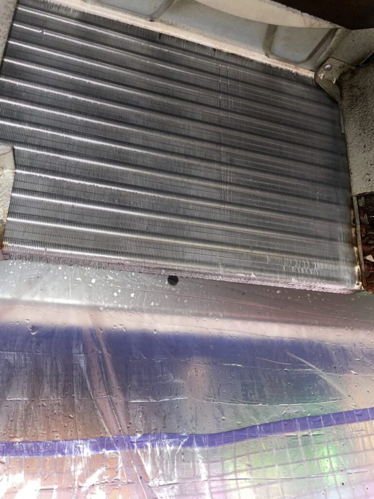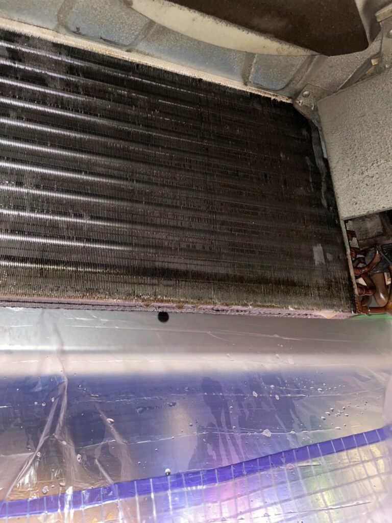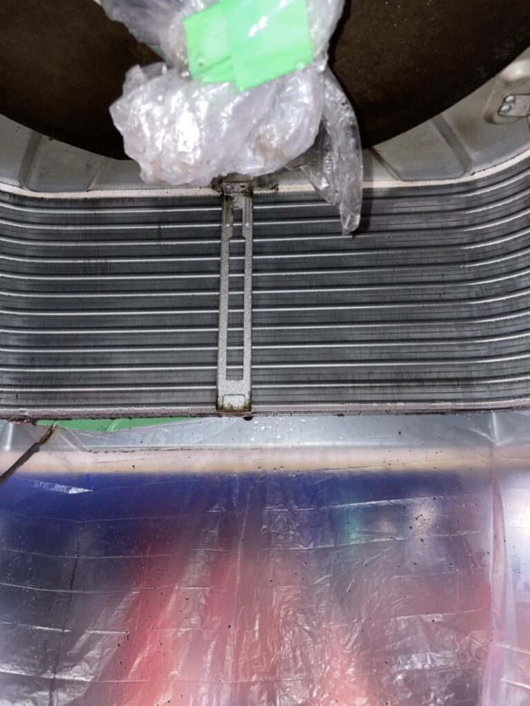 空気の通り道である熱交換器はカビ・ホコリ・ダニの死骸が大量に発生します。状況に応じた洗剤を使用し、高圧洗浄する事によってここまで綺麗になります。